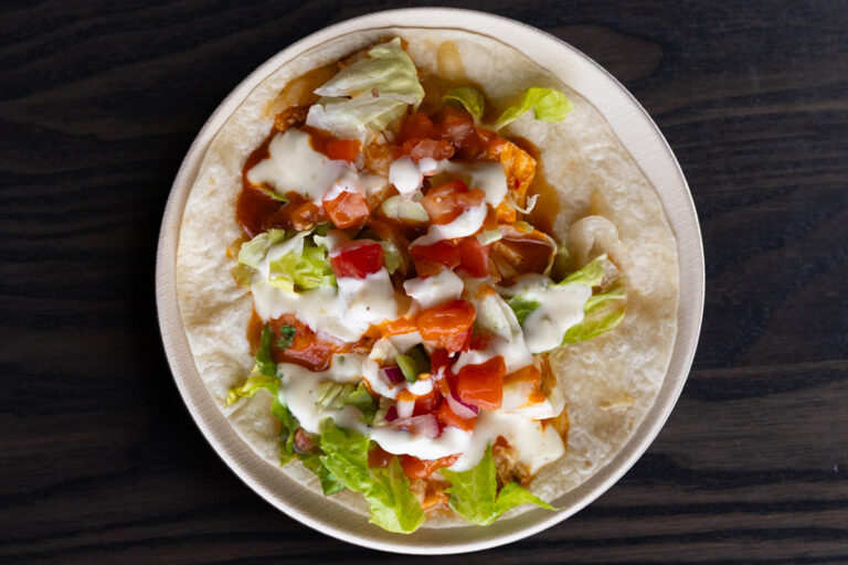 Grilled flour tortilla, crispy corn tortilla, spiced cheese, melted queso, lettuce, pico de Gallo, jalapeño, crema, served w/ Stache Sauce